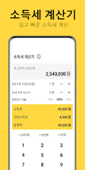 "소득세 계산기"는 2월 급여용 단순화 개정 소득세표를 기반으로 설계되었습니다. 이 프로그램에서 제공하는 계산 결과는 참고용으로만 제공되며 실제 세금 징수액과 다를 수 있습니다.